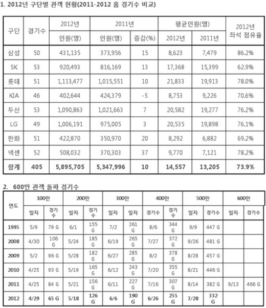 2012 팔도 프로야구의 누적관객은 22일 현재 총 589만5705명으로 600만 관객까지는10만4295명을 남겨두고 있다. 지난달 27일 역대 6번째이자 2008년 이후 5년 연속 500만 관객을 달성한 바 있는 프로야구는 2011년에 이어 2년 연속 600만 관객 돌파에 성공할 경우 본격적인 600만 관객 시대의 도래를 알릴 뿐만 아니라 역대 최다 관객인 작년의 681만명을 넘어 700만 관객 돌파라는 목표를 향해서도 순항할 수 있을 것으로 보인다.