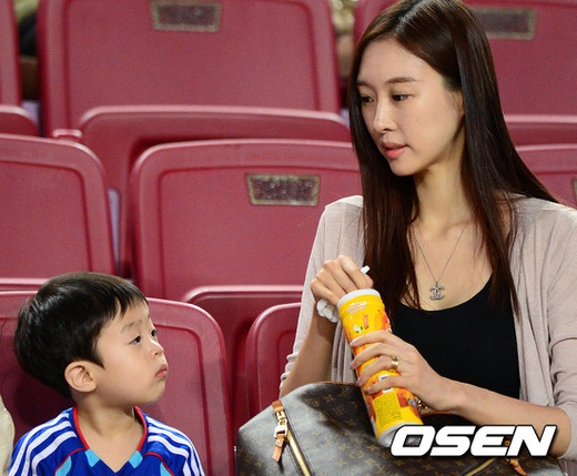 경기전 수원 정성룡의 부인 임미정씨가 아들 정강민 군과 경기장을 찾아 경기를 기다리고 있다.