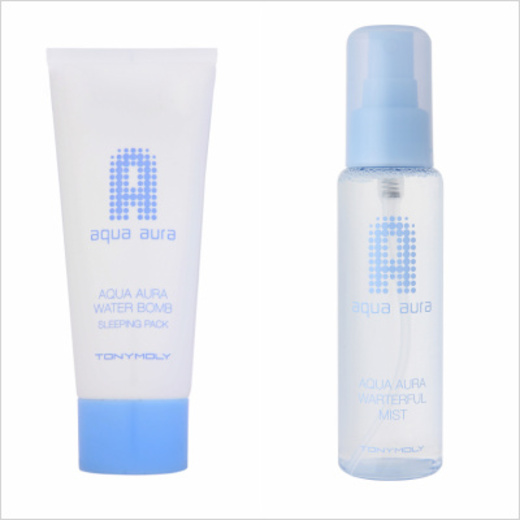 아쿠아 아우라 라인 중 ‘수분광채 수분폭탄 수면팩’은 진한 수분감이 느껴지는 젤 타입의 팩으로, 산소를 포함한 산소수와 수분을 활성화 시키는 이온수 성분과 연어알 추출물이 포함돼 있다.