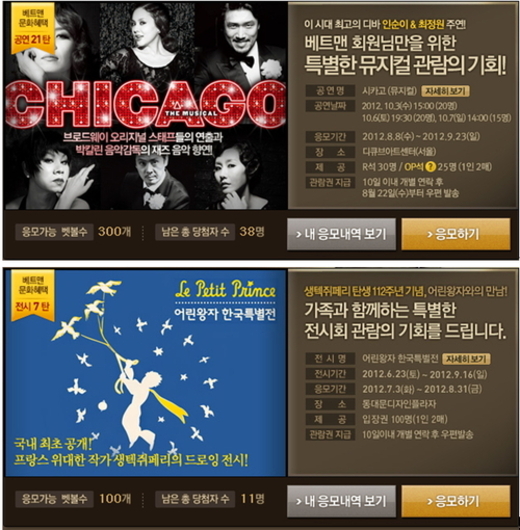 [스포츠토토] 국민체육진흥공단(www.kspo.or.kr)이 발행하는 체육진흥투표권 수탁사업자인 스포츠토토의 공식 온라인 발매 사이트 베트맨(www.betman.co.kr)이 쇼 뮤지컬의 정수 '시카고' 관람권을 제공하는 컬쳐라운지 공연 21탄 이벤트와 '어린왕자 한국특별전' 티켓을 제공하는 문화혜택 전시 7탄 이벤트가 스포츠토토 팬들로부터 뜨거운 호응을 얻고 있다.