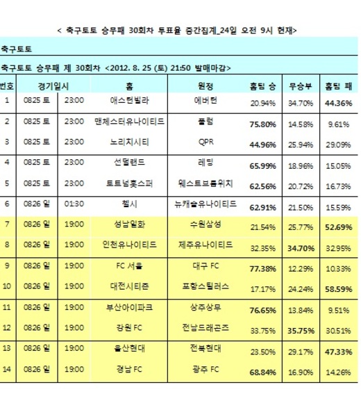 [축구토토] 국민체육진흥공단(www.kspo.or.kr)이 발행하는 체육진흥투표권 수탁사업자인 스포츠토토 온라인 공식 발매사이트 베트맨(www.betman.co.kr)은 오는 25일부터 이틀간 열리는 국내프로축구 K-리그 8경기와 잉글랜드 프리미어리그(EPL) 6경기 등 총 14경기를 대상으로 한 축구토토 승무패 30회차 투표율 중간집계 결과, 노리치시티-QPR(3경기)전에서 국내 축구팬 44.96%는 노리치시티가 박지성이 속한 QPR을 상대로 승리를 거둘 것으로 전망했다고 밝혔다.