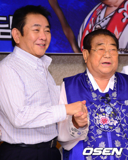 '송해 빅쇼 시즌2 '노래하는 팔도유람 송삿갓' 기자간담회가 24일 오후 서울 여의도 한 중식당에서 열렸다. 허참, 송해가 포토타임을 갖고 있다.