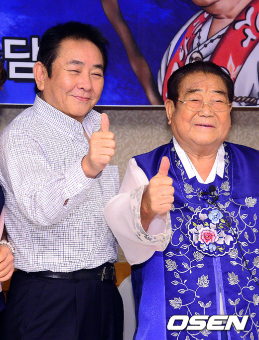'송해 빅쇼 시즌2 '노래하는 팔도유람 송삿갓' 기자간담회가 24일 오후 서울 여의도 한 중식당에서 열렸다. 허참과 송해가 포토타임을 갖고 있다.