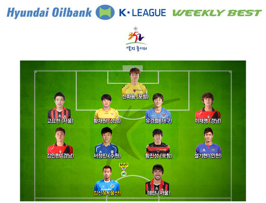 미드필더에는 팀 공격루트를 다양하게 이끌며 인천의 5연승을 견인한 설기현(인천)과 연일 공격포인트를 기록하고 있는 포항 패스 플레이의 중심 황진성(포항) 빛나는 창의적인 연계 플레이를 보여준 서정진(수원)과 경남의 그룹A 진출 가능성을 높인 감각적 페인팅과 한방의 주인공 김인한(경남)이 선정됐다.