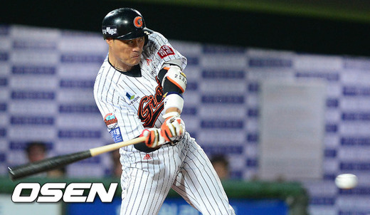 24일 오후 부산 사직구장에서 열린 '2012 팔도 프로야구' 롯데 자이언츠와 두산 베어스의 경기 5회말 2사 조성환이 우익수 앞 1루타를 치고 있다.