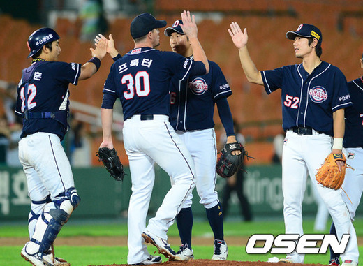 24일 오후 부산 사직구장에서 열린 '2012 팔도 프로야구' 롯데 자이언츠와 두산 베어스의 경기 종료 후 두산 선수들이 하이파이브를 하고 있다.