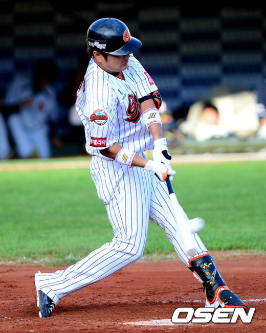 25일 오후 부산 사직구장에서 열린 '2012 팔도 프로야구' 롯데 자이언츠와 두산 베어스의 경기 3회말 1사 3루 문규현의 희생플라이를 치고 있다.