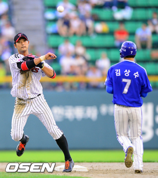 25일 오후 서울 잠실구장에서 열린 '2012 팔도 프로야구' LG 트윈스와 삼성 라이온즈의 경기 4회초 1사 1,3루 삼성 배영섭의 내야땅볼때 LG 서동욱 2루수가 1루 주자 김상수를 포스아웃시키고 있다. 타자 배영섭도 병살아웃.