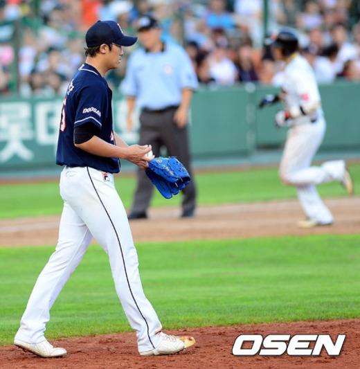 25일 오후 부산 사직구장에서 열린 '2012 팔도 프로야구' 롯데 자이언츠와 두산 베어스의 경기 5회말 1사 이용찬이 조성환에게 솔로포를 내준 후 마운드에 서있다.