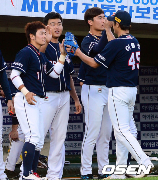 25일 오후 부산 사직구장에서 열린 '2012 팔도 프로야구' 롯데 자이언츠와 두산 베어스의 경기 6회말을 마친 이용찬이 덕아웃으로 향하며 동료들과 하이파이브를 하고 있다.