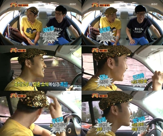 25일 오후 방송된 MBC '무한도전'에서 노홍철은 금색 스팽글로 장식된 모자를 쓰고 등장했다. 차를 운전해 녹화 장소로 향하던 노홍철은 "결혼, 하하가 결혼을 한다"고 말하며 복잡한 심경을 드러냈다.