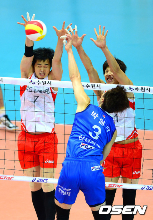 3세트 LIG 김철홍과 주상용이 삼성 박철우의 공격을 블로킹하고 있다. /youngrae@osen.co.kr