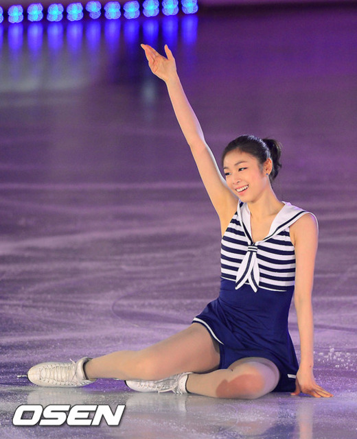 26일 오후 서울 방이동 올림픽공원 체조경기장에서 열린 '삼성 갤럭시SⅢ★스마트에어컨Q 올댓스케이트 서머 2012'에서 김연아가 팬들에게 인사를 하고 있다.