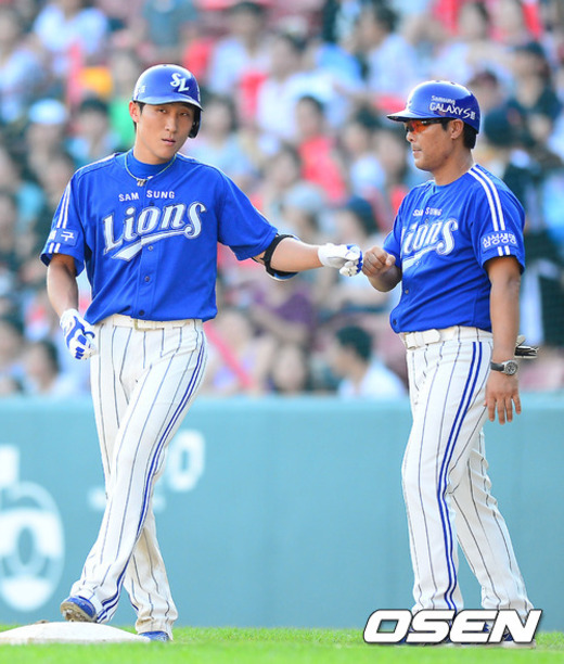 26일 오후 서울 잠실구장에서 열린 '2012 팔도 프로야구' LG 트윈스와 삼성 라이온즈의 경기에서 2회초 2사 주자 2루 배영섭이 우익수 앞 1타점 적시타를 날린 후 1루에서 김태균 코치와 하이파이브를 하고 있다.