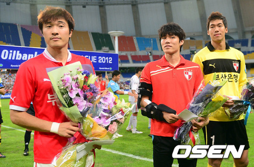 26일 오후 부산 아시아드주경기장에서 열린 '현대오일뱅크 K리그 2012' 부산 아이파크와 상주 상무의 경기 시작 전 올림픽대표팀 출신 부산 박종우, 김창수, 이범영이 환영식을 갖고 있다.