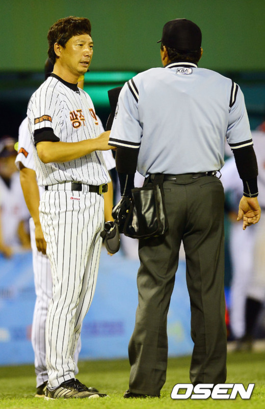 27일 오후 수원종합운동장 야구장에서 열린 제 46회 대통령배 전국고교 야구대회 진흥고와 신일고의 결승전에서 8회초 신일고 선두타자 김영환의 타석에서 진흥고 최재영 감독이 볼 판정에 대해 박휘용 구심에게 항의를 하고 있다.