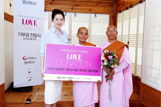 28일 종합편성채널 TV조선에 따르면 이영애는 지난 8월 27일 서울 종로구 가회동에 위치한 다사헌에서 여성조선과 함께하는 러브 도네이션 행사에 참여해 미얀마 샨마디따 사원에 학교설립기금을 전달했다.
