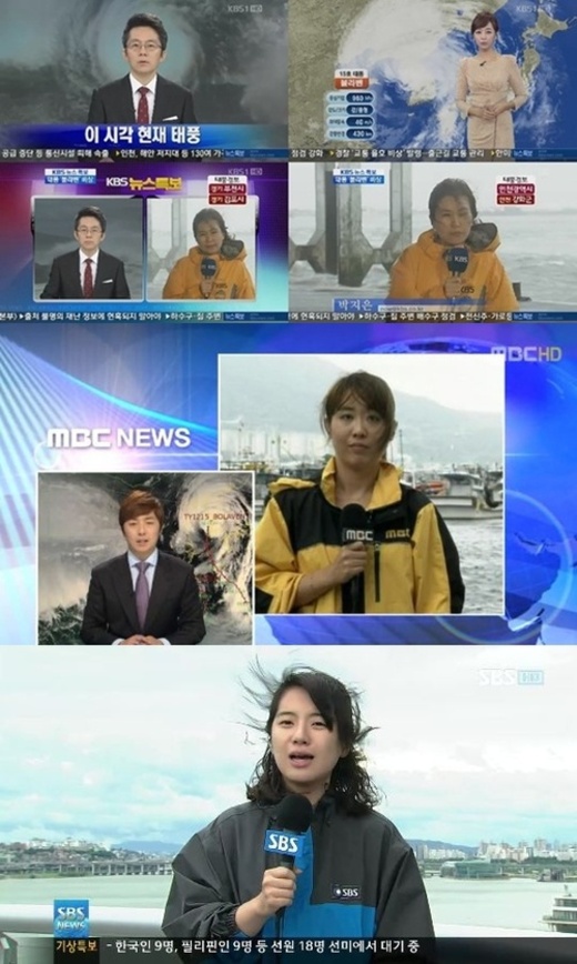 이와 함께 KBS는 태풍이 통과하는 주요 거점을 기준으로 취재기자들을 통해 현지 상황을 생생하게 전달했는데, 충남 태안 신진항의 박지은 기자와 군산 비응항의 이지현 기자 등이 서 있기도 힘든 바람이 많이 부는 상황에서도 절정의 리포팅 실력을 보여 ‘제 2의 박대기 기자’의 모습을 보여 눈길을 끌었다.