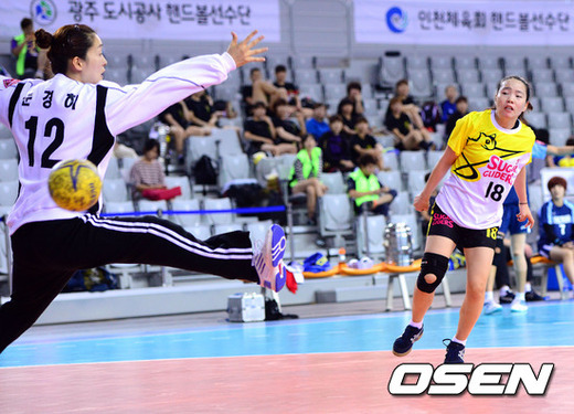 28일 오후 서울 방이동 SK핸드볼경기장에서 열린 '2012 SK핸드볼 코리아리그' 경남개발공사와 SK슈가글라이더즈의 경기, SK 김연수가 슈팅을 시도한 후 공을 바라보고있다.