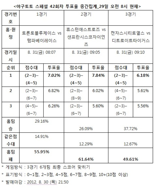 경기를 대상으로 한 야구토토 스페셜 42회차 투표율을 중간집계한 결과, 국내 야구팬의 55.95%는 토론토블루제이스-탬파베이레이스(1경기)전에서 탬파베이의 승리를 예상했다고 밝혔다.