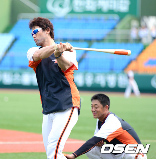 29일 오후 대전 한밭야구장에서 열린 '2012 팔도 프로야구' 한화 이글스와 넥센 히어로즈의 경기에 앞서 한화 박찬호가 배트를 들고 류현진의 훈련을 돕고 있다.