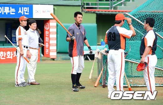 29일 오후 대전 한밭야구장에서 열린 '2012 팔도 프로야구' 한화 이글스와 넥센 히어로즈의 경기에 앞서 한화 한용덕 감독대행이 훈련 중인 선수들을 바라보고 있다.