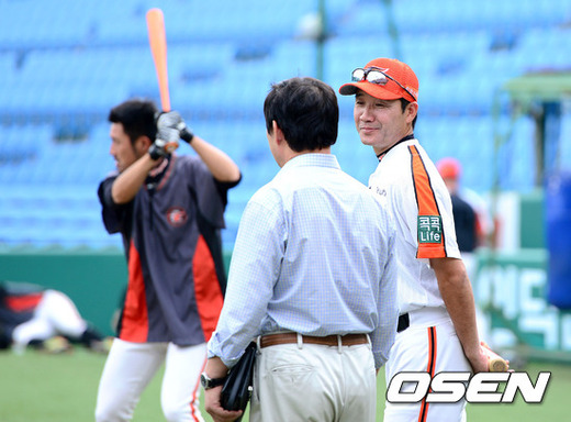 29일 오후 대전 한밭야구장에서 열린 '2012 팔도 프로야구' 한화 이글스와 넥센 히어로즈의 경기에 앞서 한화 한용덕 감독대행이 허구연 위원과 이야기를 나누고 있다.