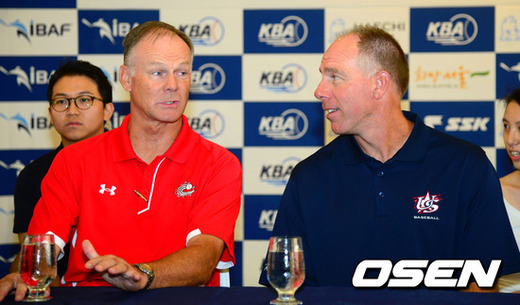 29일 오후 서울 청담동 리베라호텔에서 진행된 '제 25회 세계청소년야구대회' 출전국 감독 기자회견에서 캐나다 래리 피어슨 단장과 미국 스콧 브로셔스 감독이 이야기를 나누고 있다.