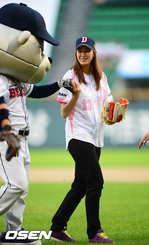 29일 오후 서울 잠실구장에서 열린 '2012 팔도 프로야구' 두산 베어스와 LG 트윈스의 경기에서 런던올림픽 여자 태권도 금메달리스크 황경선이 시구를 마친 후 철웅이가 시비를 걸자 황경선이 철웅이의 팔을 잡고 있다.