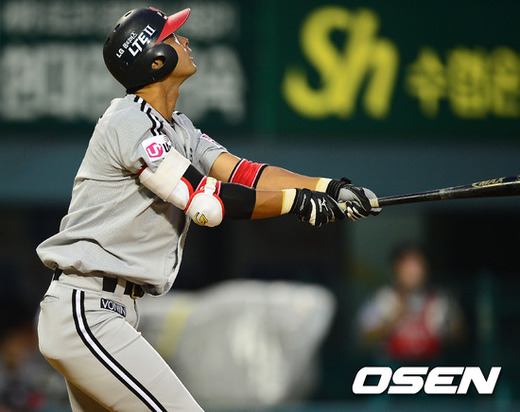 29일 오후 서울 잠실구장에서 열린 '2012 팔도 프로야구' 두산 베어스와 LG 트윈스의 경기에서 2회초 1사 주자 만루 LG 서동욱이 중견수 희생플라이 타구를 날리며 1타점을 올리고 있다.