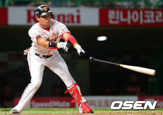 29일 오후 인천 문학구장에서 열린 '2012 팔도 프로야구' SK 와이번스와 롯데 자이언츠의 경기 3회말 2사 김강민이 헛스윙을 하면서 베트를 놓치고 있다.