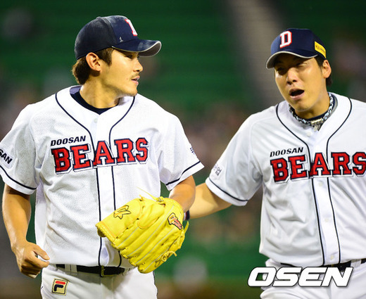 29일 오후 서울 잠실구장에서 열린 '2012 팔도 프로야구' 두산 베어스와 LG 트윈스의 경기에서 3회초를 마친 후 두산 선발 노경은과 김현수가 기쁨을 나누고 있다.
