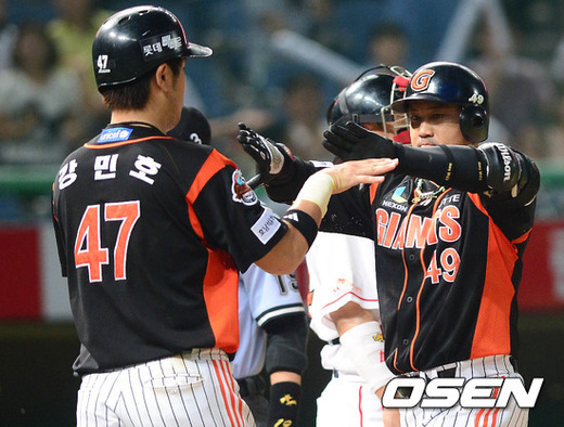 29일 오후 인천 문학구장에서 열린 '2012 팔도 프로야구' SK 와이번스와 롯데 자이언츠의 경기 6회초 무사 1루 홍성흔이 투런포를 친 후 홈에서 강민호와 하이파이브를 하고 있다.