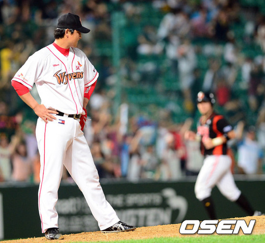 29일 오후 인천 문학구장에서 열린 '2012 팔도 프로야구' SK 와이번스와 롯데 자이언츠의 경기 6회초 무사 1루 홍성흔에게 투런포를 내준 최영필이 마운드에서 고개를 숙이고 있다.