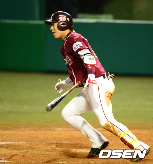 29일 오후 대전 한밭야구장에서 열린 '2012 팔도 프로야구' 한화 이글스와 넥센 히어로즈의 경기, 5회초 1사 2루 넥센 강정호가 좌전 적시타를 치고 달리고 있다.