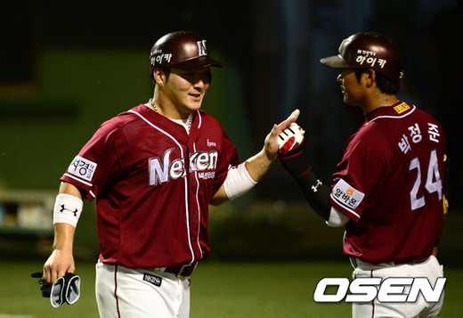 29일 오후 대전 한밭야구장에서 열린 '2012 팔도 프로야구' 한화 이글스와 넥센 히어로즈의 경기, 5회초 2사 1,3루 넥센 이성열 타석때 한화 바티스타의 폭투로 홈을 밟은 3루주자 박병호가 박정준과 하이파이브를 하고 있다.