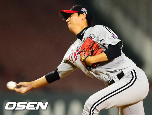 29일 오후 서울 잠실구장에서 열린 '2012 팔도 프로야구' 두산 베어스와 LG 트윈스의 경기에서 5회말 1사 주자 1,2루 LG 선발 신재웅 대신 마운드에 오른 우규민이 힘차게 공을 뿌리고 있다.