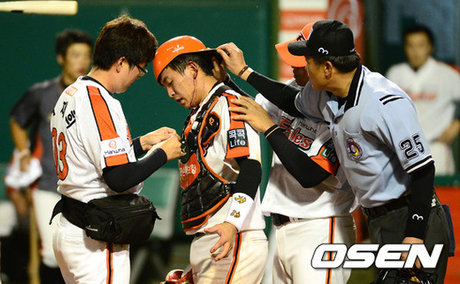 29일 오후 대전 한밭야구장에서 열린 '2012 팔도 프로야구' 한화 이글스와 넥센 히어로즈의 경기, 5회초 2사 1,3루 넥센 이성열 타석때 한화 바티스타의 투구를 맞은 포수 이준수가 트레이너의 치료를 받고 있다.