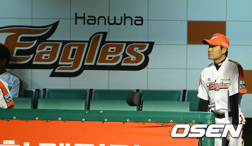 29일 오후 대전 한밭야구장에서 열린 '2012 팔도 프로야구' 한화 이글스와 넥센 히어로즈의 경기, 5회초 2사 1,3루 한화 한용덕 감독대행이 넥센 이성열 타석때 바티스타의 투구를 맞은 포수 이준수를 걱정스러운 눈빛으로 바라보고 있다.