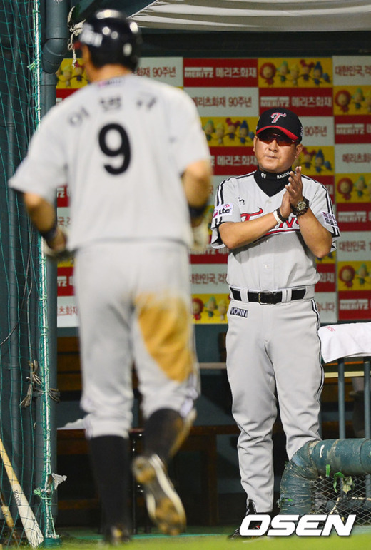 29일 오후 서울 잠실구장에서 열린 '2012 팔도 프로야구' 두산 베어스와 LG 트윈스의 경기에서 6회초 1사 주자 3루 LG 윤요섭의 중견수 희생플라이때 3루 주자 이병규가 홈으로 몸을 날리며 세이프하자 덕아웃에서 LG 김기태 감독이 박수를 보내고 있다.