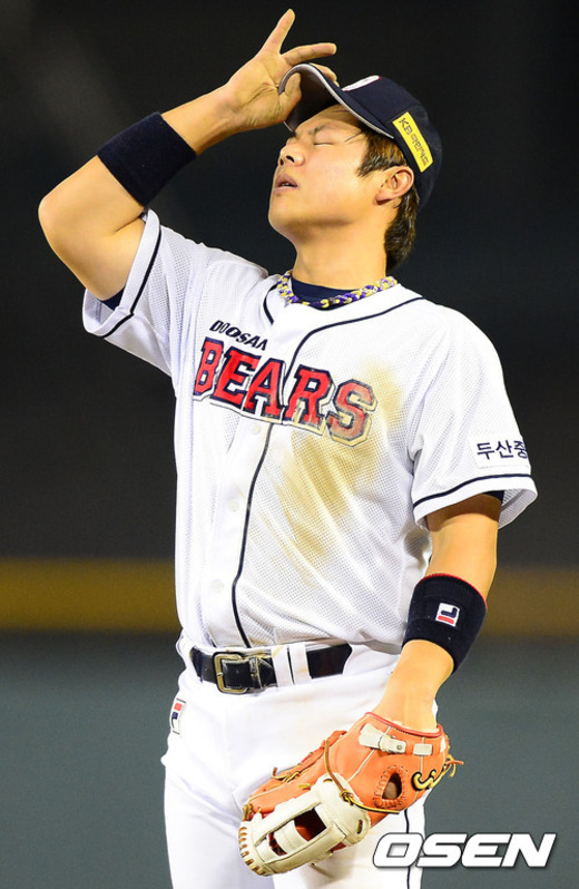 29일 오후 서울 잠실구장에서 열린 '2012 팔도 프로야구' 두산 베어스와 LG 트윈스의 경기에서 6회초 2사 주자 1,2루 LG 오지환의 타구를 두산 1루수 윤석민이 자신의 실책으로 주자 만루가 되자 윤석민이 아쉬워하고 있다.