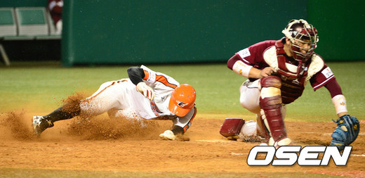 29일 오후 대전 한밭야구장에서 열린 '2012 팔도 프로야구' 한화 이글스와 넥센 히어로즈의 경기, 5회말 2사 만루 한화 김태균의 중전 2타점 적시타때 3루주자 오재필이 홈으로 쇄도해 세이프 되고 있다.