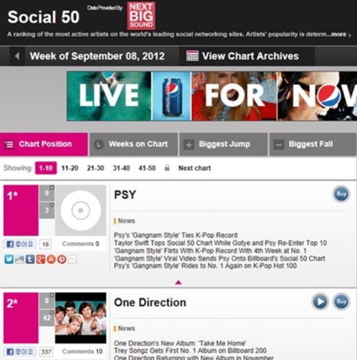 싸이는 31일 미국 빌보드차트 소셜50차트에서 '강남스타일'로 1위를 기록 중이다. 인기 아이돌그룹 원디렉션, 인기가수 테일러 스위프트, 저스틴 비버, 리한나 등을 제친 결과다.