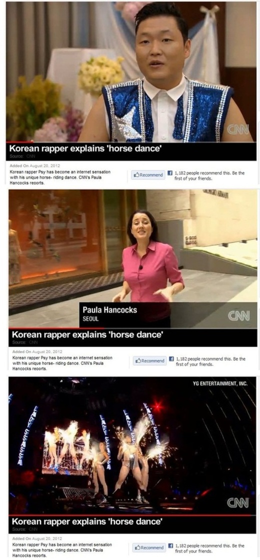 미국 유력 언론 CNN은 싸이를 두차례에 거쳐 대대적으로 소개했다. CNN은 지난 21일(한국 시간) 자사 홈페이지를 통해 '한국 랩퍼가 말춤을 설명하다'라는 제목으로 싸이의 '강남스타일'에 대한 취재 영상을 게재했다.