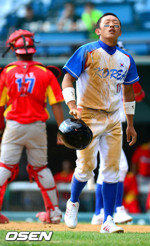 31일 오후 서울 잠실구장에서 열린 '세계청소년야구선수권대회' 한국과 베네수엘라의 경기, 2회말 1사 1루 1루주자 한국 송준석이 한승택의 안타때 홈으로 쇄도 하다 태그아웃당해 아쉬운 표정을 짓고 있다.
