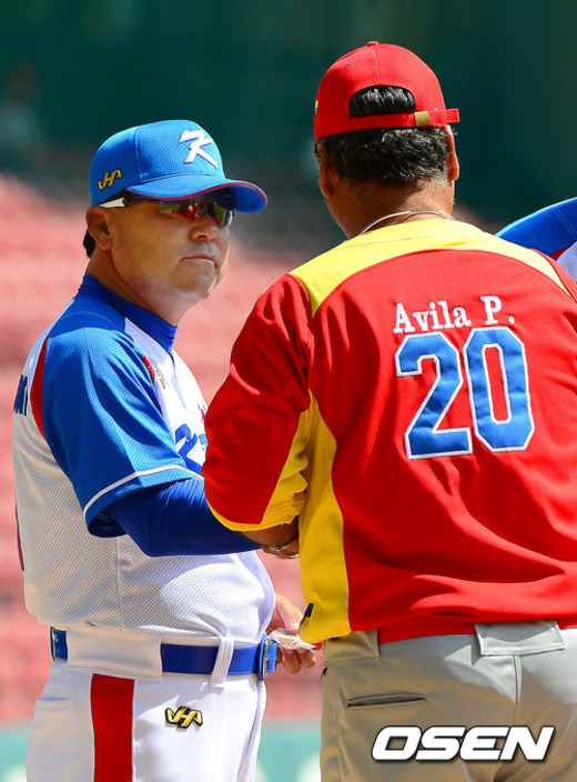 31일 오후 서울 잠실구장에서 열린 '세계청소년야구선수권대회' 한국과 베네수엘라의 경기, 한국 이정훈 감독과 베네수엘라 페드로 아빌라 감독이 인사를 나누고 있다.