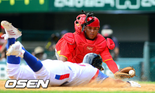 31일 오후 서울 잠실구장에서 열린 '세계청소년야구선수권대회' 한국과 베네수엘라의 경기, 3회말 2사 만루 3루주자 윤대영이 재치있는 홈스틸로 베네수엘라 윌슨 가르시가의 태그를 피해 득점을 올리고 있다.