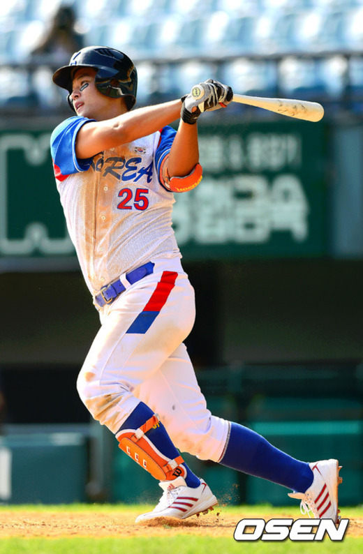 31일 오후 서울 잠실구장에서 열린 '세계청소년야구선수권대회' 한국과 베네수엘라의 경기, 5회말 윤대영이 좌전안타를 치고 있다.