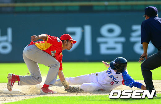 31일 오후 서울 잠실구장에서 열린 '세계청소년야구선수권대회' 한국과 베네수엘라의 경기, 7회말 1사 1루 1루 주자 계정웅이 2루 도루를 시도하다 2루에서 태그아웃 당하고 있다.