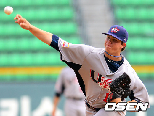 1일 오후 서울 잠실구장에서 열린 '세계청소년야구선수권대회' 한국과 미국의 경기, 1회말 미국 키건 톰슨이 역투하고 있다.